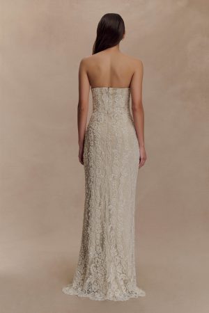 The EVA Hand Beaded Pearl & Lace Maxi Dress is a masterclass in refined femininity. Designed with a strapless neckline and a sculpted. boned bodice. it offers structure and support while showcasing the décolletage. Intricately hand-beaded pearl embellishments cascade across delicate lace. adding texture. shimmer. and artisanal beauty. Fully lined for comfort and finished with an invisible zip closure. this dress is an heirloom-worthy piece—made for moments that deserve to be remembered.
