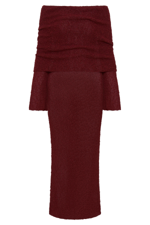 MARISOL is a ribbed design dress made from a Boucle material that is both flattering from up close and across the room. The natural stretch of the fabric creates a figure-sculpting silhouette. while also featuring a unique drape-styled. off-shoulder neckline combined with flared long sleeves. Style yours with the to complete the look.