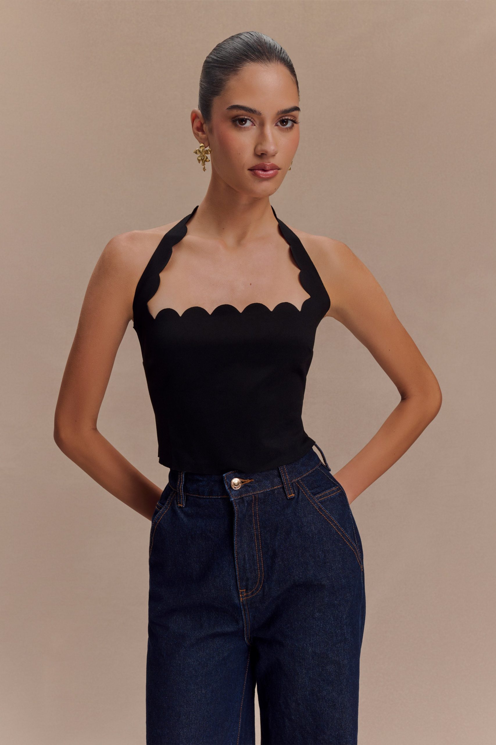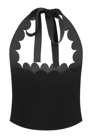Elevate your wardrobe with the SELENA Scalloped Jersey Halter Top. a chic blend of modern sophistication and playful charm. Featuring a flattering halter neckline with adjustable ties. this top offers a customisable fit that highlights your shoulders and décolletage. The scalloped neckline detail adds a touch of elegance. while the cropped length keeps it fresh and contemporary. Perfect for pairing with high-waisted jeans. skirts. or shorts. this top is a versatile piece that transitions seamlessly from casual outings to stylish evenings.